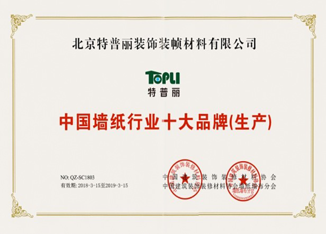 【榮譽】特普麗墻紙連續9年榮獲“中國墻紙行業十大品牌(生產)”!